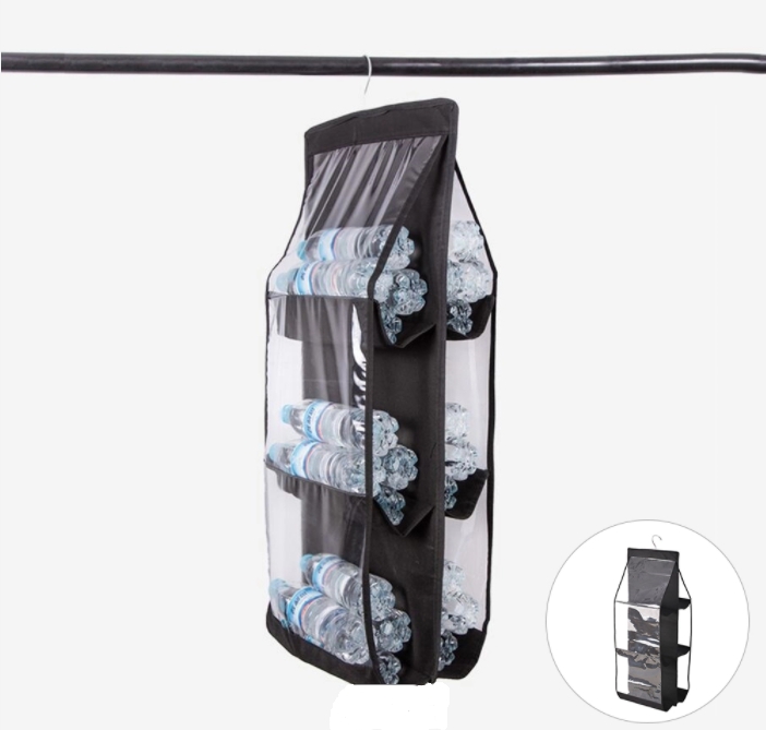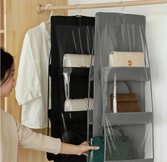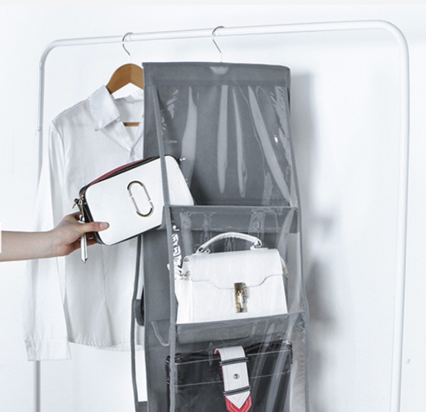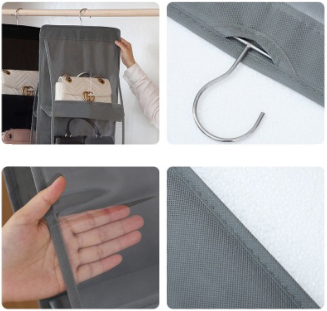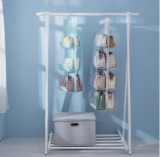 Двусторонний органайзер для сумок на 6 отделений по три секции с каждой стороны. В одну секцию может влезть даже пару штук. Прекрасно помещается в шкаф, не занимает много места, при необходимости компактно складывается. Внешняя сторона органайзера выполнена из прозрачного материала, который позволяет видеть содержимое. В комплекте идут плечики. Размеры отделений идеально подходят для сумок, но могут использоваться и для хранения других вещей. Такая конструкция подвесного органайзера для сумок позволяет видеть, какой аксессуар лежит и быстро его достать. Кроме того, данный органайзер можно как использовать подвесной модуль и хранить в нем также крупногабаритные вещи — подушки или одеяла.