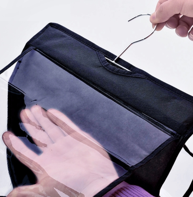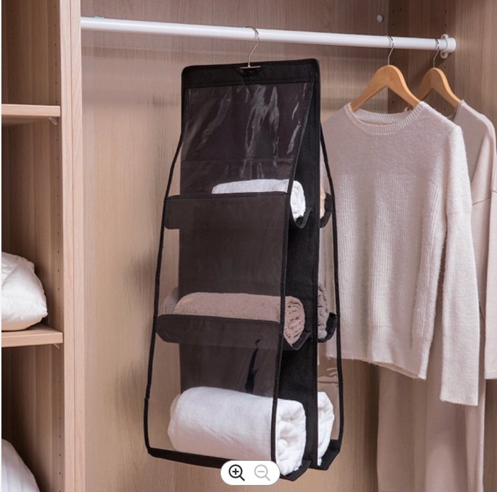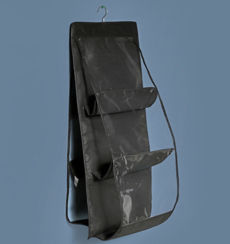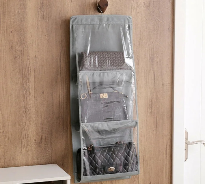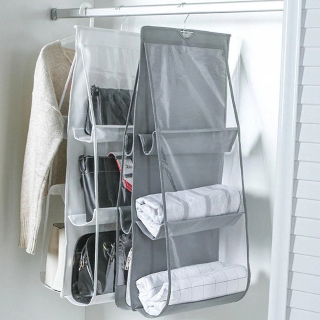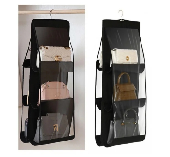 Двусторонний органайзер для сумок на 6 отделений по три секции с каждой стороны. В одну секцию может влезть даже пару штук. Прекрасно помещается в шкаф, не занимает много места, при необходимости компактно складывается. Внешняя сторона органайзера выполнена из прозрачного материала, который позволяет видеть содержимое. В комплекте идут плечики. Размеры отделений идеально подходят для сумок, но могут использоваться и для хранения других вещей. Такая конструкция подвесного органайзера для сумок позволяет видеть, какой аксессуар лежит и быстро его достать. Кроме того, данный органайзер можно как использовать подвесной модуль и хранить в нем также крупногабаритные вещи — подушки или одеяла.